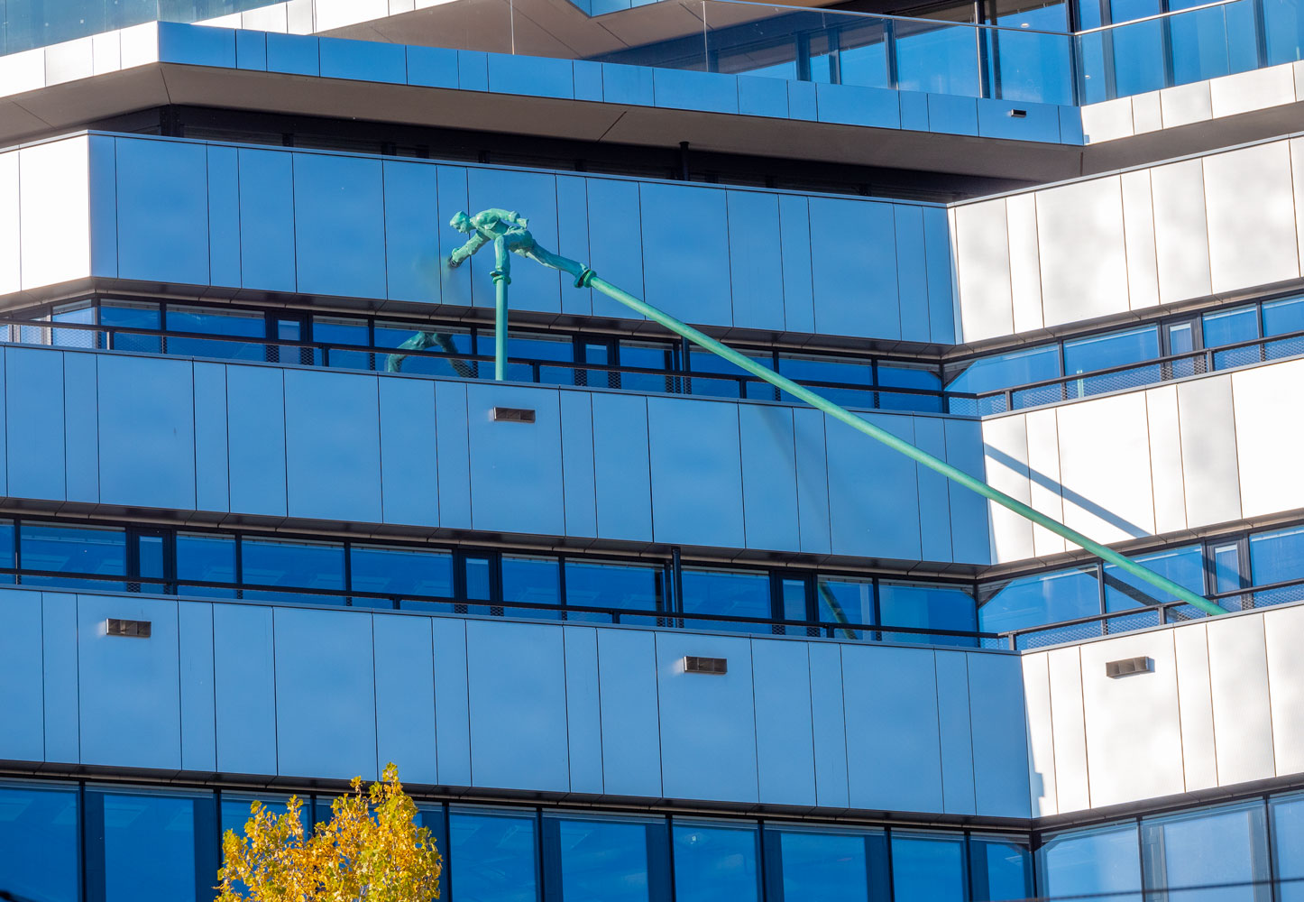 The mirrored finish was removed from the building façade. The new stainless steel cladding on the façade has a fine embossed finish that is glare-free and silk matt. Terraces create additional open spaces for restaurants and offices and counteract the former seclusion of the building.