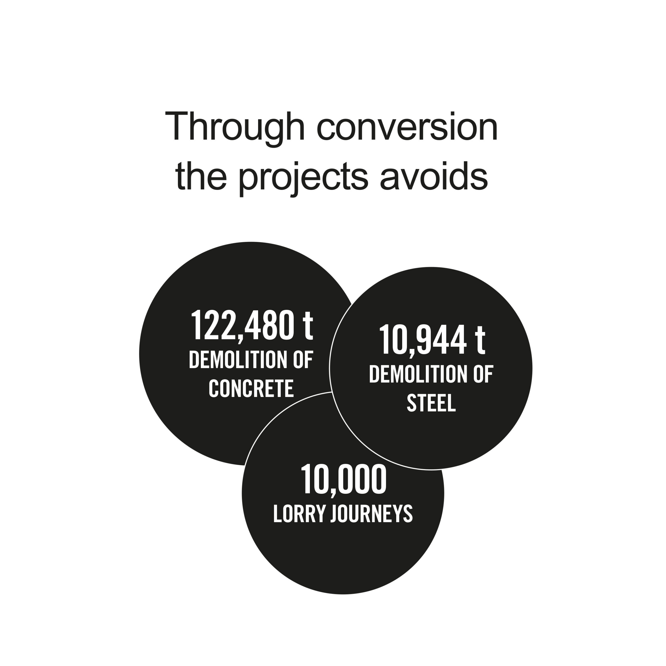 By preserving and converting existing structures, the construction of Francis saved 18,625 tonnes of CO² – that is 67 per cent less CO² emissions than would have been released during demolition and new construction.