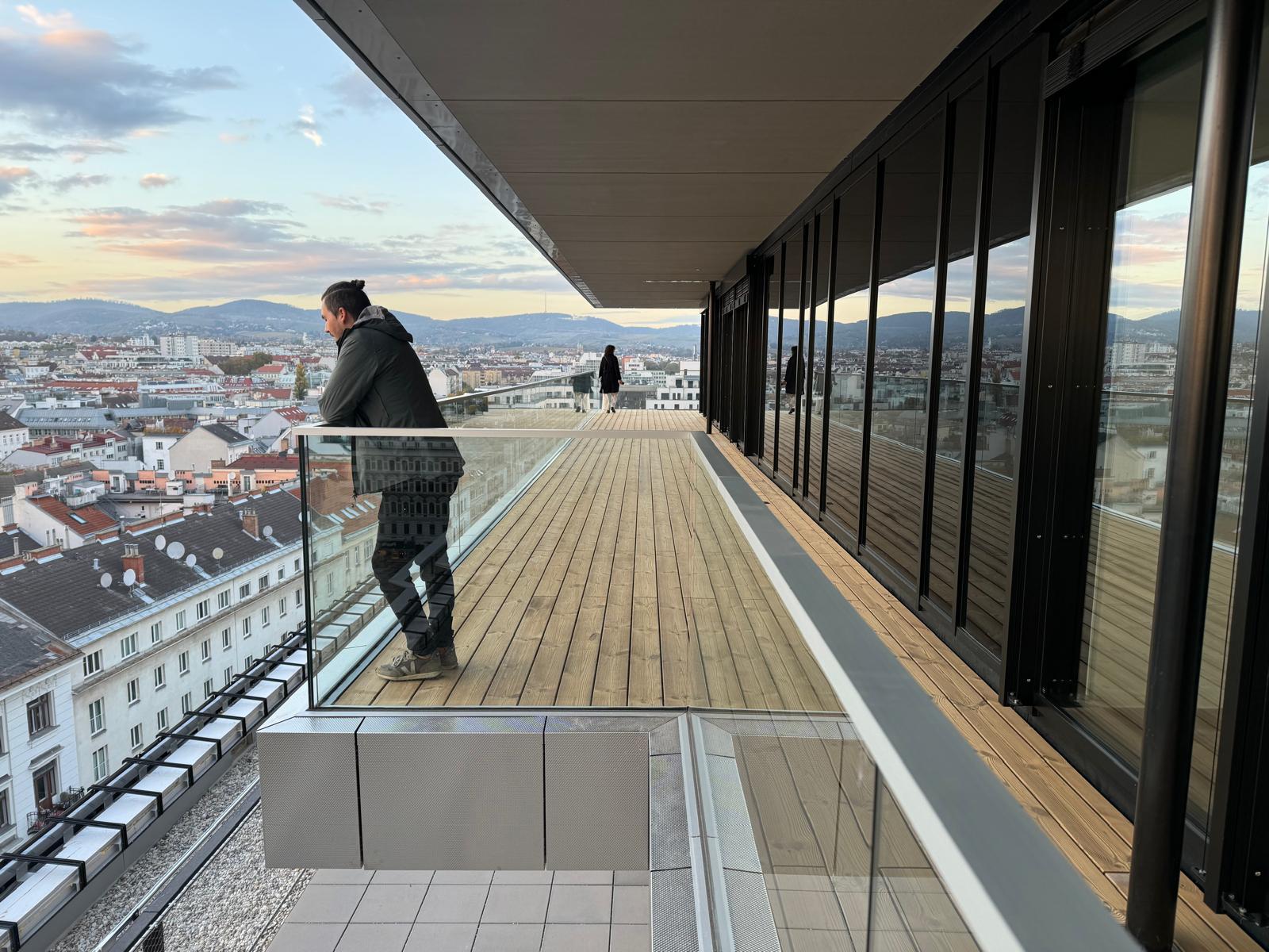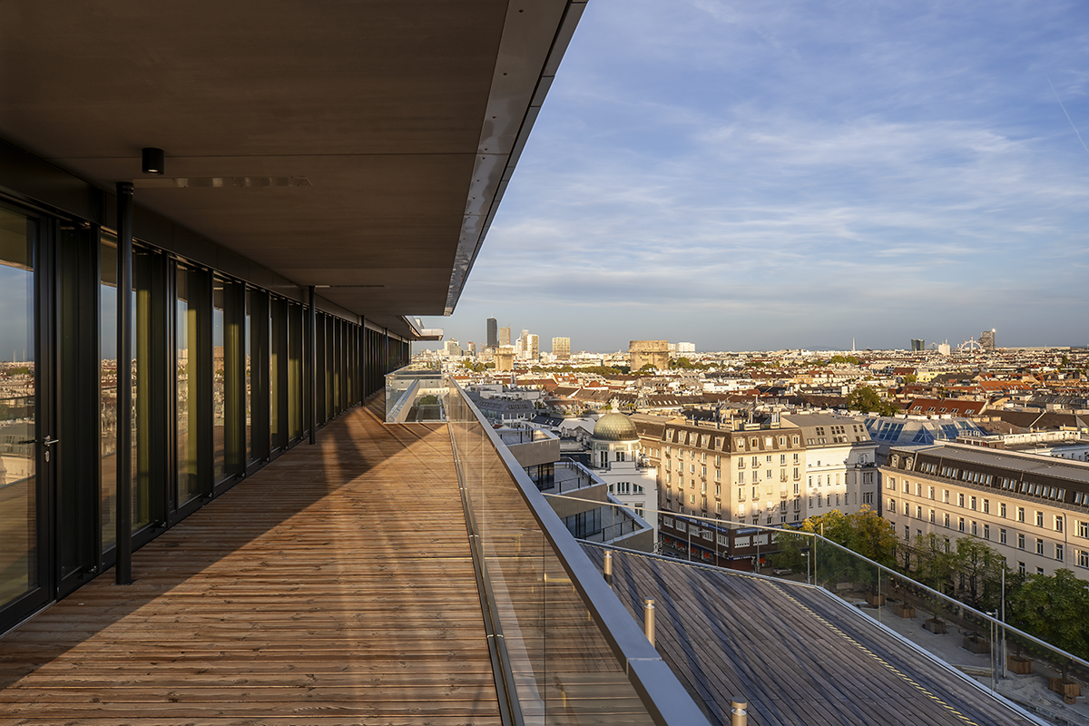 The eight office storeys with their spacious outdoor areas offer around 40,000 m² of usable space, looking out over the neighbouring palaces, Liechtenstein Park and across the city centre to St. Stephen‘s Cathedral. The optimal connection to the local and long-distance transport network, with all major means of public transport accessible within a few minutes, is forward-looking. The connection to the nearby bike routes along the Danube Canal is just as ideal. Secure bicycle parking spaces are available on the first floor of Francis. The intelligence of the building is also evident in the supply and disposal system: this is organised via the underground loading yard, thus keeping above-ground delivery traffic to a minimum.