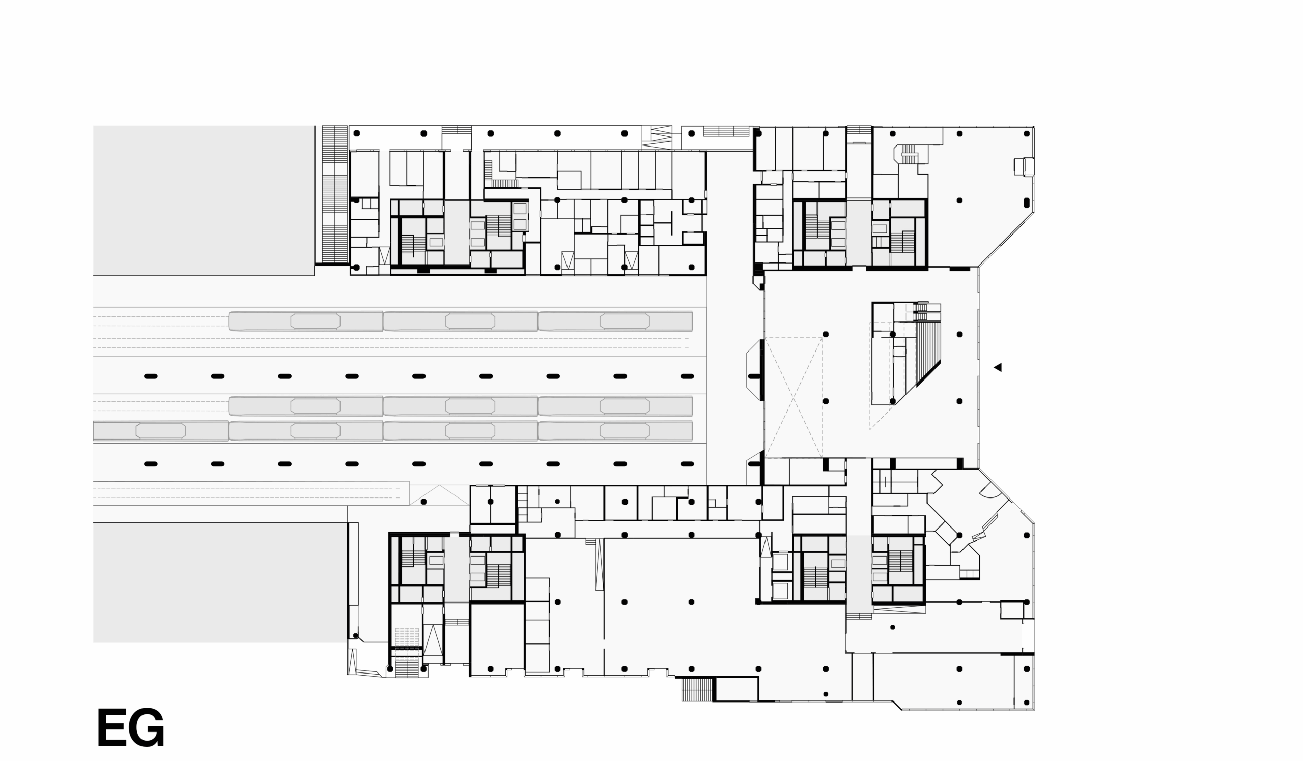 Another planning focus was on the design of a lively base area. The extensive opening of the base achieves the desired spatial connection to Julius-Tandler-Platz, makes the station concourse more attractive and creates an inviting connection to the central plaza level. On the northern rear side of the building, a connecting structure from the 1970s between the office complex and the car park was removed in order to return to Karl Schwanzer’s original idea of a cubic, freestanding building.